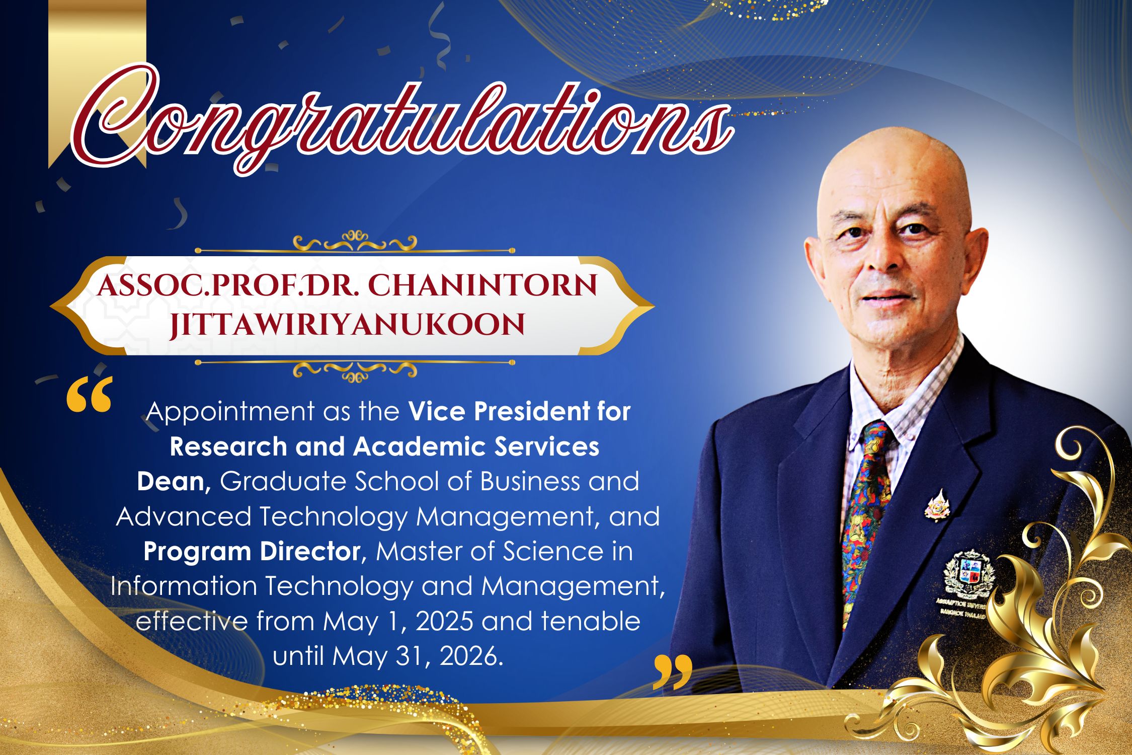 Officially appointed by Assumption University to become Associate Professor (in Information Technology)