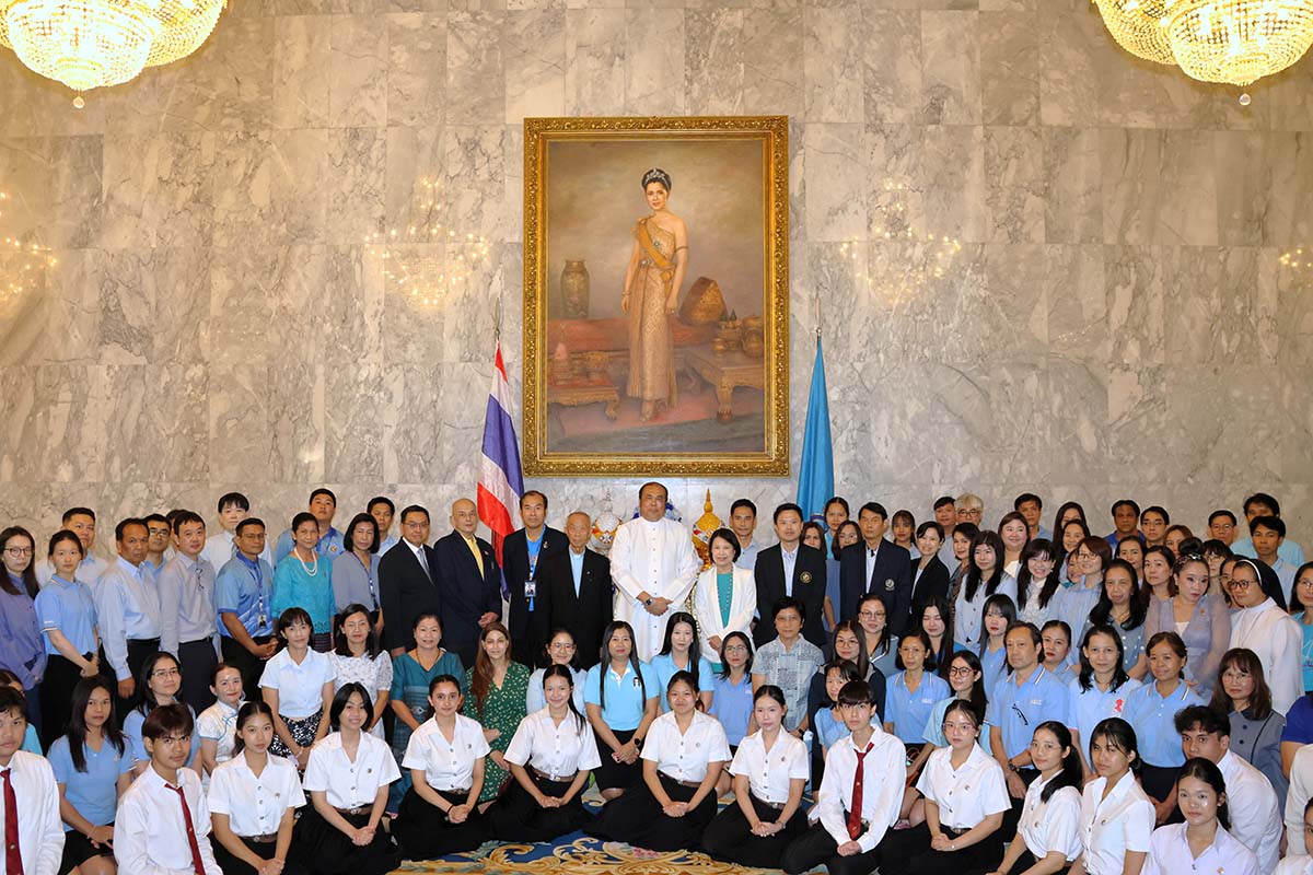 At the Suvarnabhumi Campus, the morning ceremony began at 1.30 p.m. in the Queen Room, CL Building. The President of the University led the proceedings, which included the floral tribute, the singing of the Royal Anthem, and a bilingual recital of Felicitous Poems. The event concluded with all participants singing “Sadudee Phra Mae Thai Song”—a touching tribute to The Queen Mother’s grace and service.