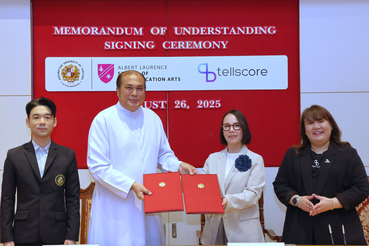 Bangkok, August 26, 2025Assumption University of Thailand (AU), through its Albert Laurence School of Communication Arts, officially signed a Memorandum of Understanding (MoU) with Tellscore Company Limited, one of Thailand’s leading influencer marketing platforms. The ceremony took place at the Cathedral of Learning, Suvarnabhumi Campus, marking a milestone collaboration designed to bridge academia and the fast-growing digital communication industry.