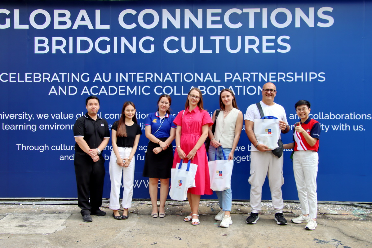 Following a warm welcome at Suvarnabhumi Campus, the guests enjoyed a guided tour of AU’s key landmarks and facilities—from the elegant Sala Chaturamuk Paijit and the CL Building to the University Library and Sports Center. A highlight of the morning was a visit to the Confucius Institute, where the Foggia team engaged in a hands-on Chinese calligraphy session and tried their hand at a traditional cultural mini-game, creating joyful moments and cross-cultural connections.