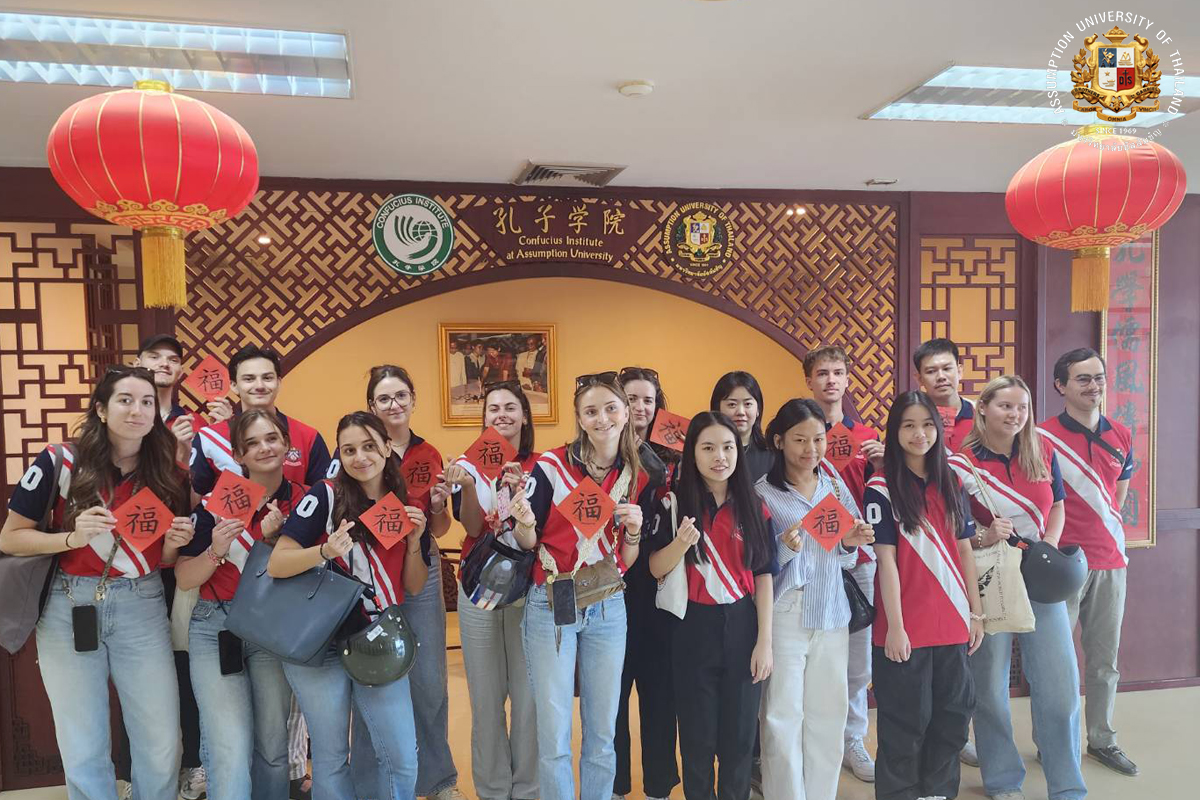 Next, we visited the Confucius Institute at AU (7th floor, CL Building), where a professor shared insights into Chinese history and culture. Students learned the art of Chinese calligraphy, practiced writing with a brush in celebration of the upcoming Chinese New Year, played traditional Chinese games, and tried the Guzheng (古筝), a classical Chinese musical instrument. By 3:30 PM, we returned to Hua Mak Campus, marking the end of a lively and enriching welcome day.