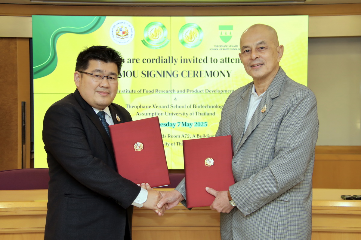 In a milestone moment for academic collaboration, the Theophane Venard School of Biotechnology at Assumption University of Thailand (AU)  signed a Memorandum of Understanding (MOU) with the Institute of Food Research and Product Development of Kasetsart University on May 7, 2025.